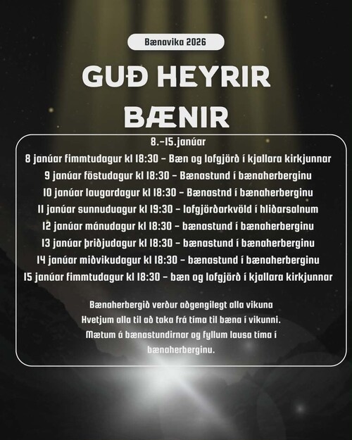 Bænavika Fíladelfíu stendur yfir 8. til 15. janúar. Bæn og lofgjörð, beðið fyrir komandi ári og því sem framundan er. Stöndum saman í bæn og biðjum Guð að leiða, styrkja og lækna og að hans ríki megi koma okkar á meðal.